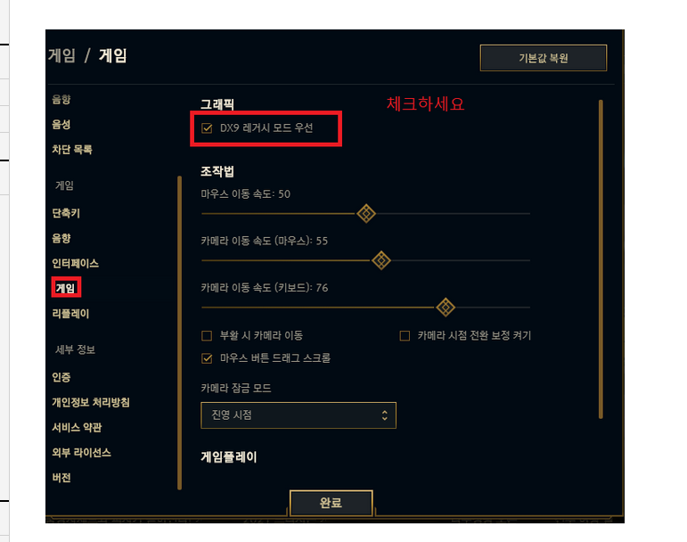 게임 탭의 'DX9 레거시 모드 우선' 을 체크해주고 저장해줍니다.