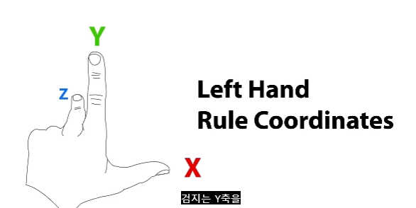 유니티의 XYZ 체계는 아래의 손 사진처럼 왼손 엄지와 검지를 펼치면 알 수 있습니다.