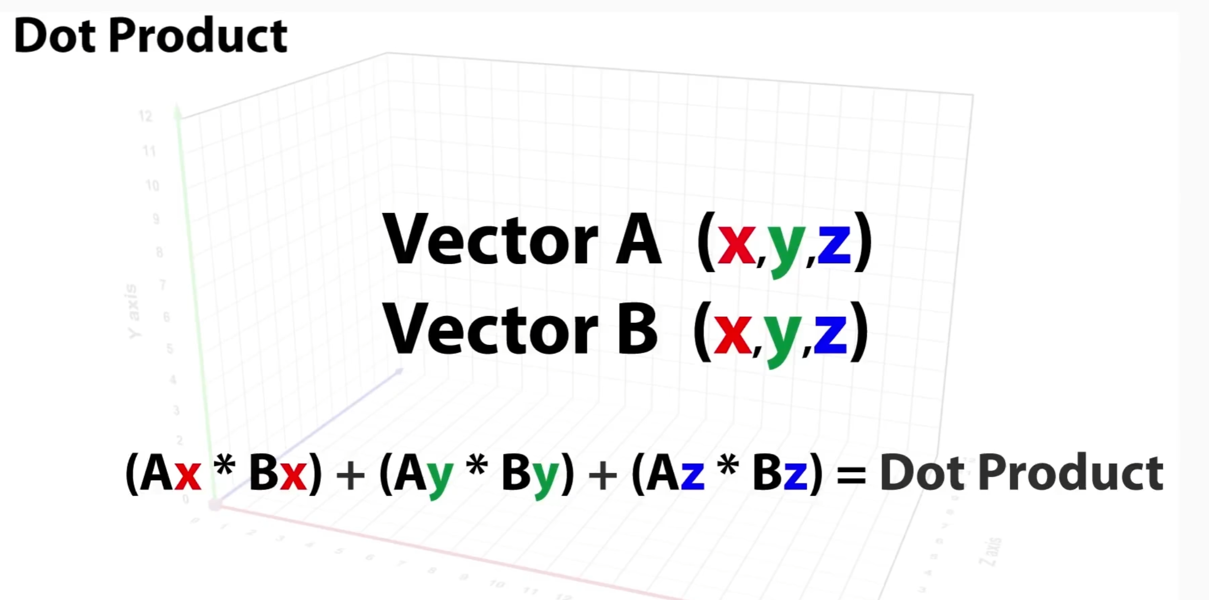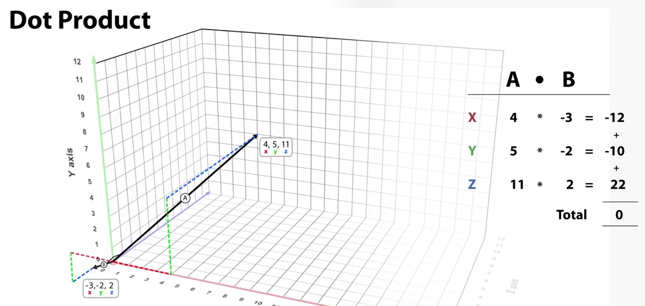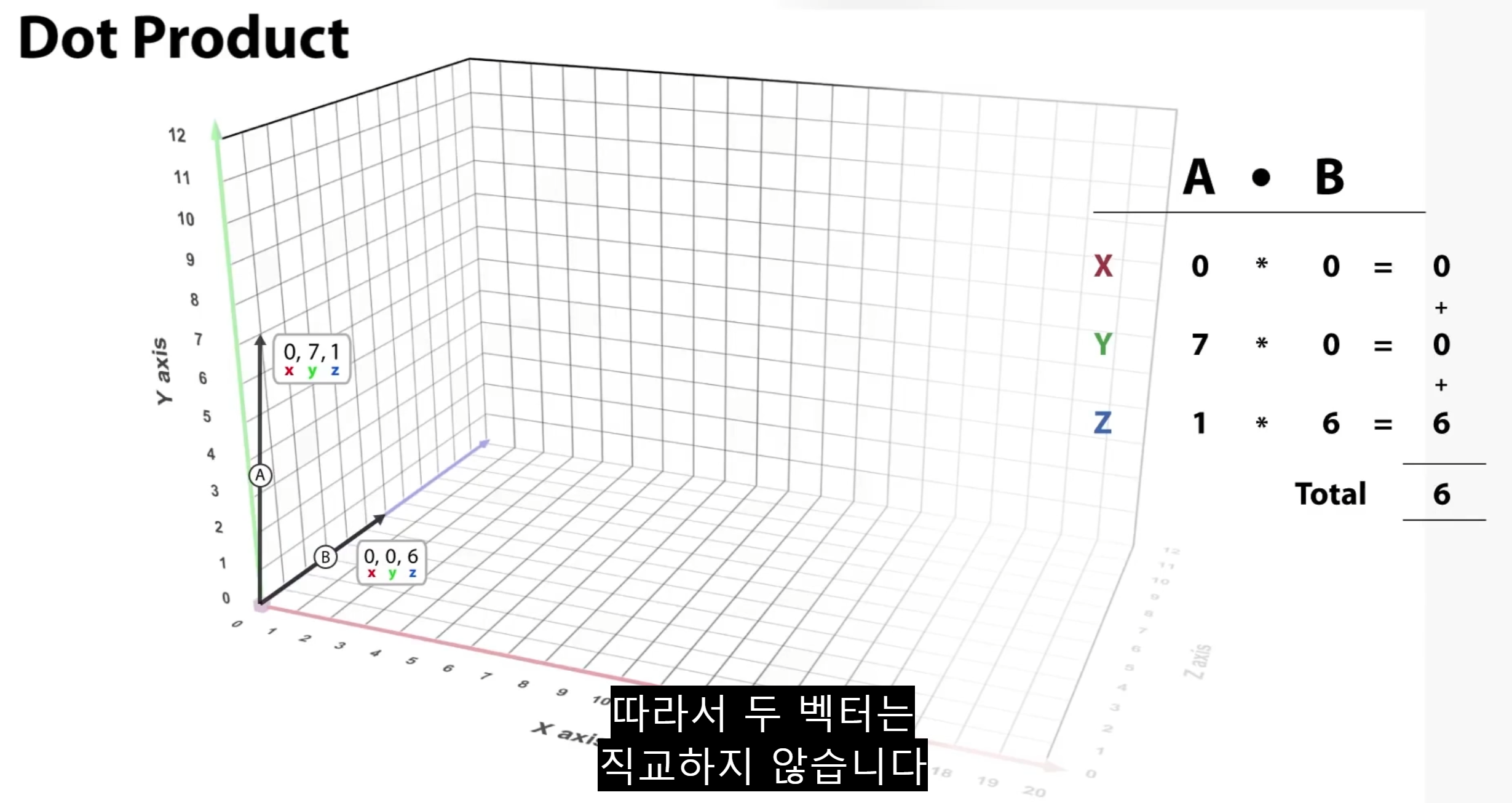 두 벡터 A와 B의 내적을 구하기 위해 각 벡터의 X,Y,Z를 각각 곱하여 합산합니다.